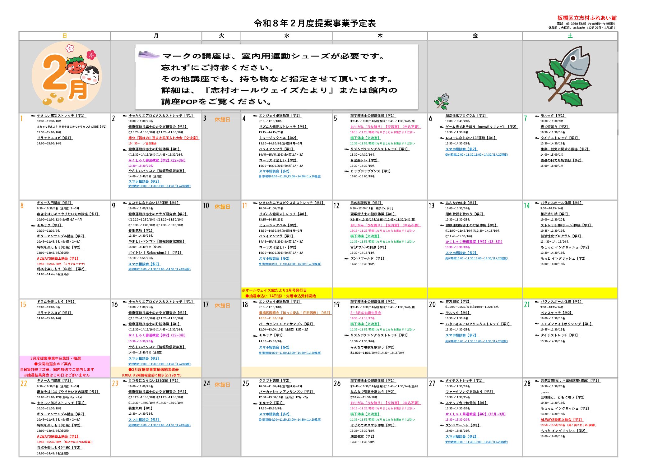※2月の提案事業申込方法※ ①抽選申込講座 抽選申込用紙を2階応募箱へ投函 抽選申込期間:1月10日(土)~14日(水) ※1月13日(火)は休館日の…